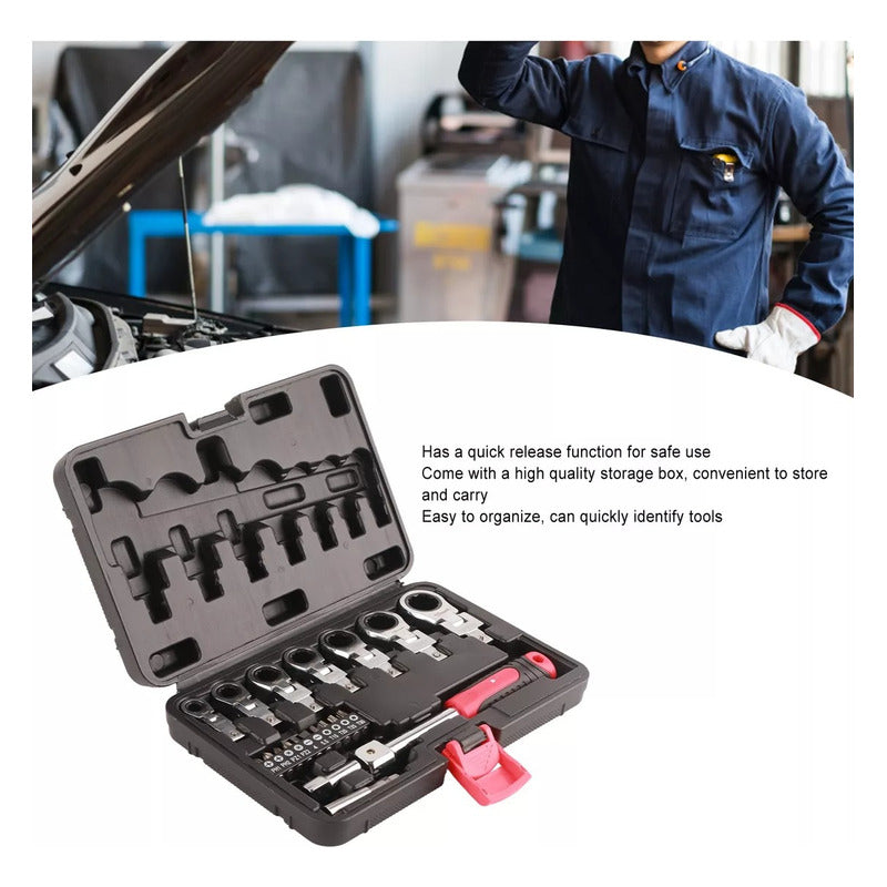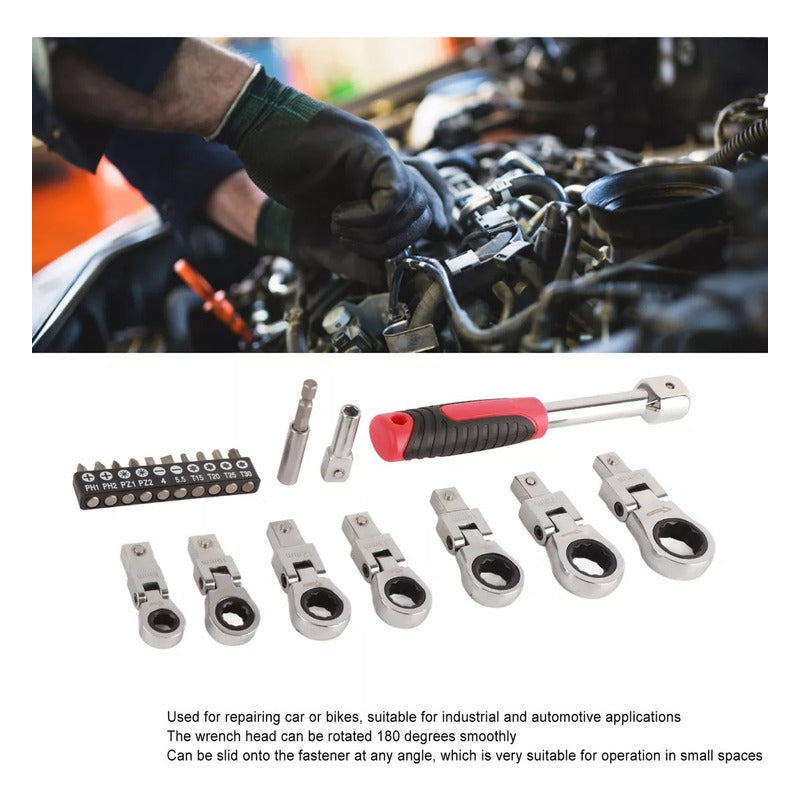 20 piezas Juego de llaves de trinquete de cabeza flexible Juego de herramientas Torx grande métrico Juego de llaves planas giratorias Juegos de destornilladores con estuche Hecho de cuerpo forjado CR-V Chrome Vanadium de alta calidad para un torque y resistencia confiables, durabilidad excepcional y resistencia duradera resistente a la corrosión; Cabezales flexibles de 180 grados Con un giro suave de 180 grados, los cabezales mantienen cualquier ángulo para deslizarse sobre los sujetadores. Son libres de moverse con cada golpe, lo que permite que la llave navegue alrededor de las obstrucciones a lo largo de la trayectoria de giro Las herramientas mecánicas vienen en un estuche extraíble para accesorios de herramientas eléctricas, por lo que es fácil de transportar Amplia aplicación: desde reparaciones en carretera hasta retoques con el automóvil o la bicicleta, adecuado para aplicaciones industriales y automotrices