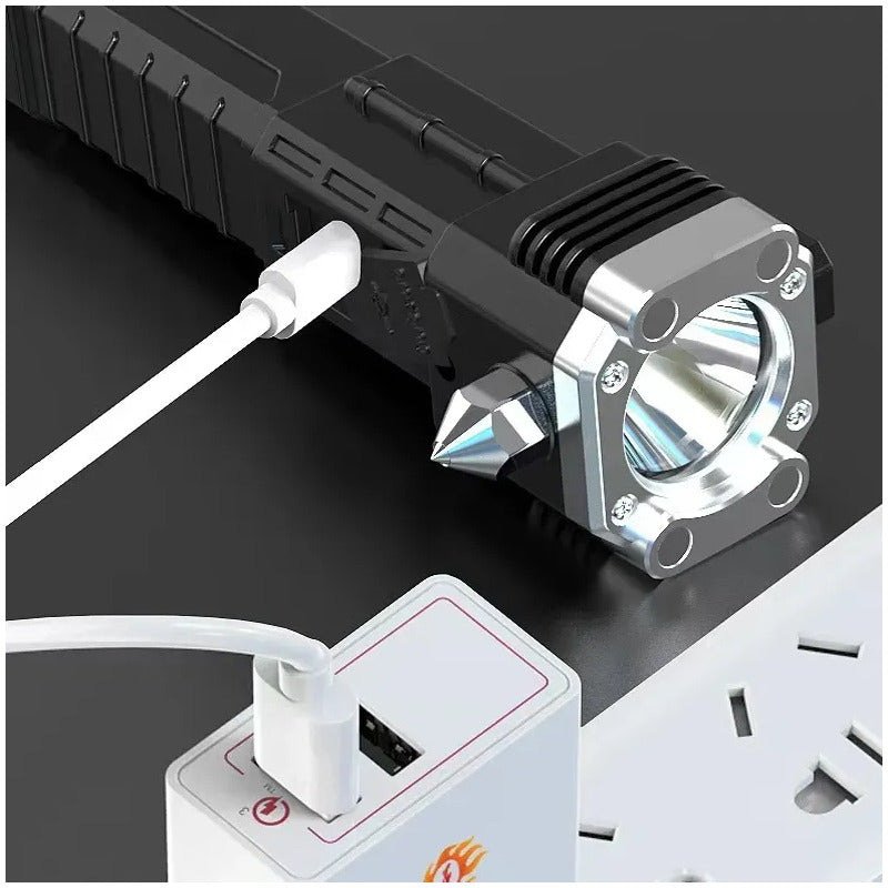 Linterna LED multi-herramienta-Recargable y resistente al agua, brillante lámpara herramienta para emergencias, Camping y seguridad en el coche (con rompecristales y cortador de cinturón de seguridad) Especificación: Nombre: linterna de coche multifuncional Material: ABS ABS Color: plata Tamaño: 170mm * 50mm * 35mm/6.69in * 1.97in * 1.38in Bombilla: OSL LED + COB luz lateral Batería: 1 * 18650 Método de carga: carga directa usb Interruptor: pulsador El paquete incluye: 1* Linterna 1* Cable USB